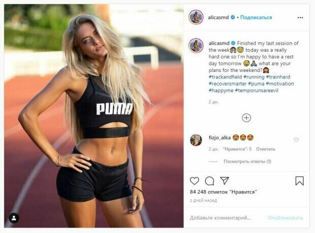 Шмидт без смущения похвасталась рельефным прессом, который не был скрыт нарядом. Об этом пишет Politeka.net со ссылкой на страничку знаменитости. "Как сейчас выглядят мои дни: тренируюсь, ем, сплю, повторяю", - написала девушка под фото. Фанаты поставили более 150 тысяч лайков и написали комментарии: "Я тебя обожаю, это нормально", "Бомба", "Самая красивая женщина", "Милосердие", "лучшая девушка такая великолепная", "В конце концов, мужчины и женщины тренируются по одной и той же причине. Оказаться в прекрасном женском теле", "Продолжай без выходных!", "Великолепная дива", "Я люблю тебя! Мой любимый бегун!", "Выглядит так хорошо и потрясающе! Люблю твою улыбку". Сообщалось, что известная спортсменка Алиса Шмидт показала себя после тренировки и рассказала о выходном. На фото красавица позирует в черном топе и шортах, соблазнительно выгнувшись для фото. Красавица специально распустила волосы, чтобы кадр на беговой дорожке получился максимально жарким. Напомним, самая красивая легкоатлетка Алиса Шмидт восхитила ножками в дерзком мини А еще Politeka писала, что самая красивая легкоатлетка Алиса Шмидт в эффектных разрезах показала настоящий соблазн Также Politeka сообщала, что самая красивая легкоатлетка Алиса Шмидт восхитила рельефами в кровати