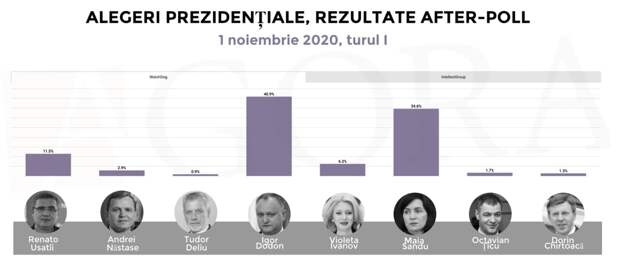 Явка на выборах президента Молдовы, которые состоялись в воскресенье, составила 42,7%. Экзит-пулов не проводилось. Их заменил телефонный опрос, проведенный компанией «Intellect Group» и ассоциацией «SPERO». В нем приняли участие 3 600 человек из Республики Молдова, США, Канады, стран ЕС и России, а также Приднестровья.