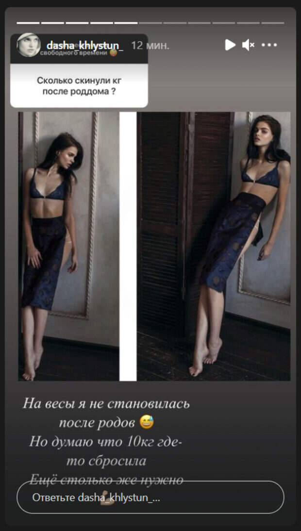Спустя короткое время после знакомства с Максом девушка забеременела. В апреле Хлистун родила дочку. Поклонники поинтересовались у Даши, сколько она весит после родов. «На весы я не становилась после родов. Но думаю, что 10 кг где-то сбросила. Еще столько же нужно», - отметила Хлистун. Также поклонники поинтересовались, как девушка приводит себя в форму. «Пока, к сожалению, никак. Кроме того, что не ем больше все, что ела. Мне запретили два месяца заниматься спортом. Но, я планирую понемногу начинать уже. Интересовал фанатов и вопрос питания. Они захотели узнать, что же кушает молодая мама для того, чтобы похудеть. «Я сейчас ем не для фигуры, а для молока. Это овсянка. Либо на воде, либо на кокосовом молоке. Иногда омлет (очень редко). Гречка, индейка, рыба, бульон куриный, еще тост авокадо тоже иногда ем и сырники», - рассказала Хлистун. Напомним, что "Холостяк" Михайлюк не сдержал эмоций рядом со спящей женой и дочерью: "Кто больше устал?". Как сообщала Politeka, "Холостяк" Михайлюк показал, как поддерживает свою родившую жену: «У мамы сегодня праздник!». Также Politeka писала, что жена "Холостяка" Михайлюка откровенно рассказала, как он удачно "подкатил" к ней год назад: "Как видите. ..".