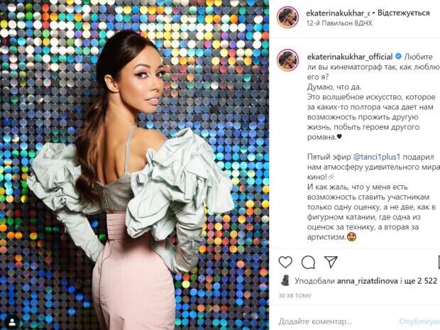 «Любите ли вы кинематограф так, как люблю его я? Думаю, что да. Это волшебное искусство, которое за каких-то полтора часа дает нам возможность прожить другую жизнь, побыть героем другого романа», - начала свой рассказ Кухар. Звезда напомнила, что в пятом прямом эфире участники шоу танцевали в тематике кино. Каждый выбирал свое произведение. По словам Кухар, ей очень жаль, что в проекте нельзя ставить две оценки – отдельно за технику и за артистизм. «Фаворитом для меня в этом эфире, однозначно, стал танец по мотиву фильма «В джазе только девушки» в исполнении @sergeimelnik и @adelina.deli. Ребята, вы молодцы! Это был неожиданный и стремительный прорыв!», - подчеркнула Кухар. За полчаса пост балерины собрал более 2500 лайков. В комментариях ей оставили много отзывов. «Шикарно выглядите», «Какая ты красивая», «Мельник не перестает удивлять, мне также понравилось, как он достойно и до конца был в образе, очень талантливо», «Вы прекрасна», - пишут люди. Напомним, что печальная Екатерина Кухар заявила о нажитых врагах. Как сообщала Politeka, острая на язык Кухар метко ответила побитой жизнью Ольге Фреймут: "Я поняла, что вы... ". Также Politeka писала, что конфликт Фреймут и Кухар на "Танцях з зірками" вышел на новый уровень хамства.