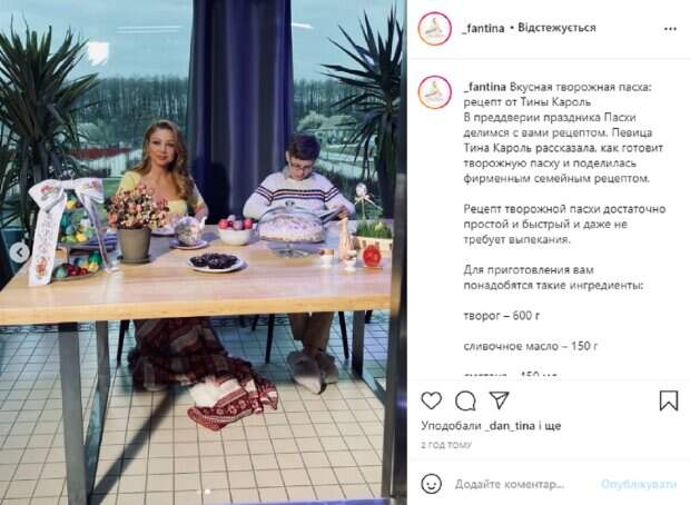 На кадрах видно, что звездная мама с сыном занимаются перед пасхальным декором, а на столе стоит поднос, видимо, с той самой творожной паской. "Вкусная творожная пасха: рецепт от Тины Кароль. В преддверии праздника Пасхи делимся с вами рецептом. Певица Тина Кароль рассказала, как готовит творожную пасху и поделилась фирменным семейным рецептом. Рецепт творожной пасхи достаточно простой и быстрый и даже не требует выпекания", - говорится в подписи к фотографиям певицы и ее сына. А дальше расписан подробный рецепт праздничного блюда. Пользователи тут же принялись обсуждать новые снимки, делится своими впечатлениями от рецепта, а также собственным опытом приготовления пасок к празднику. "Пойду попробую этот рецепт", "Какая милота", "Жаль, что в этом году Тина ничего такого не проводит. Мы надеялись", "А можете, пожалуйста, сказать, откуда фото?", "Кто помнит Тинин пасхальный флешмоб с яйцами?", "Классный рецепт, нужно попробовать", "Какие красивые", "Обожаю вас", "Супер рецепт", - пишут пользователи в комментариях к фото. Напомним, Кароль призналась, кому принадлежит ее сердце, и это не Балан: "Люблю его безумно". Как сообщала Politeka, Тина Кароль закатила сцену ревности известному ведущему: "Кто здесь была до меня? ". Также Politeka писала, Влюбленная Кароль позволила приласкать себя молодому брюнету, и это не Дан: "Гарем уже трещит по швам".