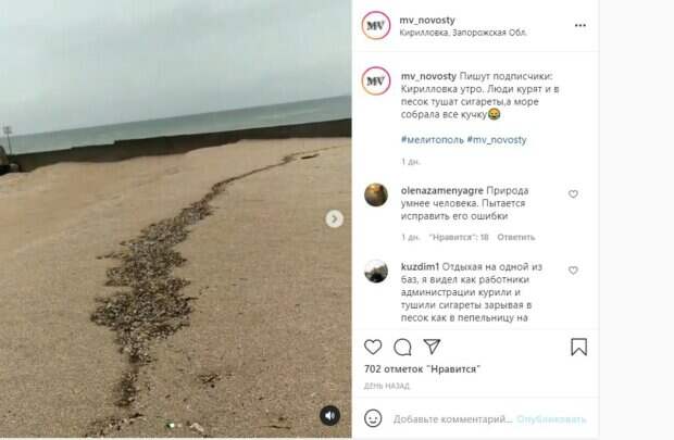 Отдыхающие в Кирилловке столкнулись с неприятной картиной на побережье моря Как передает Politeka.net, происходящее на одном из пляжей поселка показали в сети (чтобы посмотреть видео, доскролльте страницу до конца) На опубликованных кадрах видно гору окурков, которых судя по всему, выбросило штормом из Азовского моря.