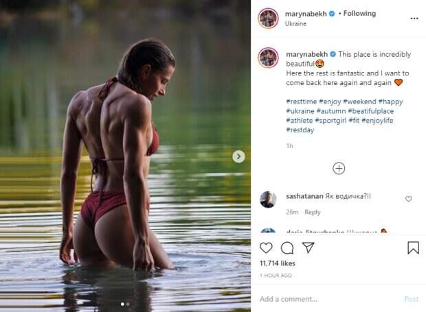На первом снимке спортсменка замерла с мокрыми волосами, погрузившись по бедра. Она засмотрелась в воду с задумчивым взглядом, напрягла спину и позволила любоваться своим мускулистым телом. С этого ракурса хорошо видны упругие ягодицы красотки. На другом кадре Марина запечатлена, рассекая водную гладь, девушка зашла глубже, подняв брызги руками. "Это место невероятно красивое