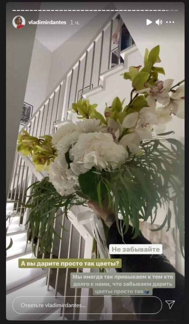 "Не забывайте. А вы дарите просто так цветы? Мы иногда так привыкаем к тем, кто долго с нами, что забываем дарить цветы просто так", - написал муж Дорофеевой. На кадрах певец стоит с большим букетом и протягивает его. Владимир позвал жену, которая стала спускаться по лестнице: "Помощь нужна", - произнес загадочно артист. Увидев цветы Надя не смогла скрыть восторг, она, улыбаясь, поинтересовалась: "Это что такое?". Муж ответил: "Тебе" Надя с улыбкой продолжила: "Я вышла к тебе в "лоховских" джинсах. Не снимай". Также артист ответил на вопрос подписчиков о "любви" втроем. "Тут, мне кажется, зависит все от договоренности внутри пары. Если оба за - то кайф. Если один/одна сомневается, то нельзя давить", - написал Дантес. Отметим, Владимир Дантес и Надя Дорофеева познакомились на одном из мероприятий. Первый сразу заприметил красотку, и они спустя небольшое время стали встречаться и жить вместе. Напомним, Надя Дорофеева поиграла на нервах Дантеса, снимая все на камеру Как сообщала Politeka, муж Дорофеевой Дантес раскрыл секрет, как "выглядеть дороже" Также Politeka писала, Дорофеева в экстра-мини и топе с вырезом засветила плоский животик