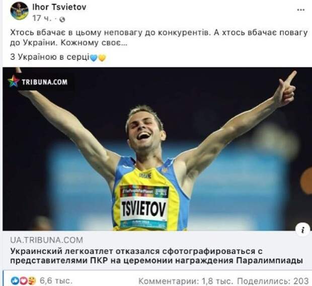 Вчера украинский бегун Игорь Цветов, занявший второе место, отказался фотографироваться с бронзовым и золотым призерами из РФ. Дмитрию Сафронову и Артему Калашяну пришлось позировать вдвоем, пока Цветов неловко топтался на пьедестале. Причем непонятно, было ли это умышленным политическим заявлением, либо парень попросту испугался скандала. Сам Цветов утверждает, что таким образом выразил уважение к Украине, но искренность его слов вызывает сомнение. Попробуй тут не вырази! К слову, пост в Facebook он удалил, остался лишь скрин. Зато политик-телеведущий Сергей Притула доволен: Позже наши коллеги из telegram-канала Klymenko Time выяснили, что Цветов все же фотографировался с российскими спортсменами, однако это было несколько месяцев назад. На чемпионате Европы по лёгкой атлетике МПК в польском Быдгоще. Снимок есть на сайте брянского СМИ. Что же изменилось за два с половиной месяца? Произошла история с Магучих, вот что. Как мы и предполагали, украинский спортсмен просто не захотел был заклеванным «патриотами». Еще пара забавных моментов из трансляции. Когда Игорь решил не подходить к бегунам из России, комментатор ехидно высказался по этому поводу: «Мы видим, что Игорь действительно недоволен, и что он не очень хочет фотографироваться со спортсменами из ПКР. Я его прекрасно понимаю». А российская журналистка Ольга Скабеева заметила, что из эфира телеканала «UA:Перший» вырезали музыку Чайковского, которая играла вместо гимна РФ. Петр Ильич больше не принадлежит к славному украинскому роду из-под Полтавщины? А вообще, это такой детский сад, что даже возмущаться по этому поводу как-то не комильфо. В СССР, воевавшим с Германией не на жизнь, а на смерть, продавались пластинки с музыкой Рихарда Вагнера, а Юрий Левитан не оскорблял по радио Геббельса, не смеялся над немецкими знаменитостями и уж тем более не называл Гитлера нецензурными словами. Когда культурный уровень наших медиа успел так низко упасть? И почему мы этим гордимся? Понравился материал? Поставьте ему 5 звезд. Это важно для автора.