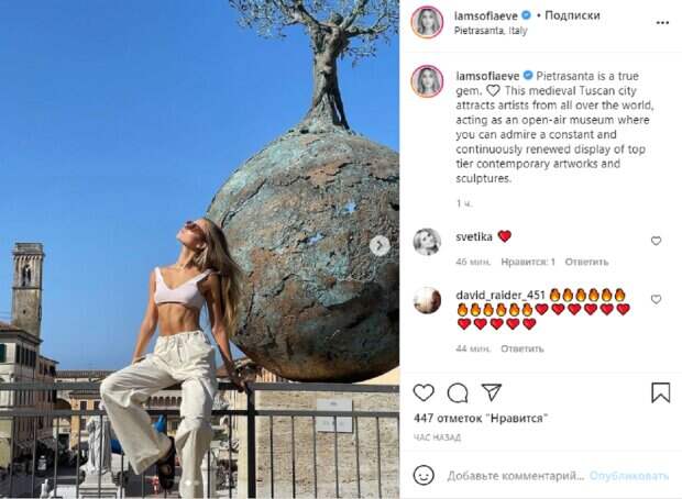 При этом 20-летняя Соня не упускает возможности покрасоваться на ярких фото, чтобы продемонстрировать свою совершенную фигуру. Она показала в Instagram потрясающие формы в новой фотосессии, "выгуляв" соблазнительный наряд. Соня Евдокименко в очень коротком топе без лифчика и широких штанах вылезла на забор, демонстрируя аппетитные формы, упругий живот и длинные ножки в очень летнем стиле. «Пьетрасанта - настоящая жемчужина. Этот средневековый тосканский город привлекает художников со всего мира, действуя как музей под открытым небом, где вы можете полюбоваться постоянной и постоянно обновляющейся экспозицией современных произведений искусства и скульптур высшего уровня», - написала красотка. Напомним, Внучка Ротару в платье-ночнушке приковала взгляды к загорелой коже: "Конфетка". Как сообщала Politeka, Внучка Софии Ротару развлекается на любимом острове богачей: как Мадонна и Дженнифер Лопес. Также Politeka писала, что Внучка Ротару в шортах и мини-топе раскрыла секрет идеальной фигуры: красноречивые кадры.