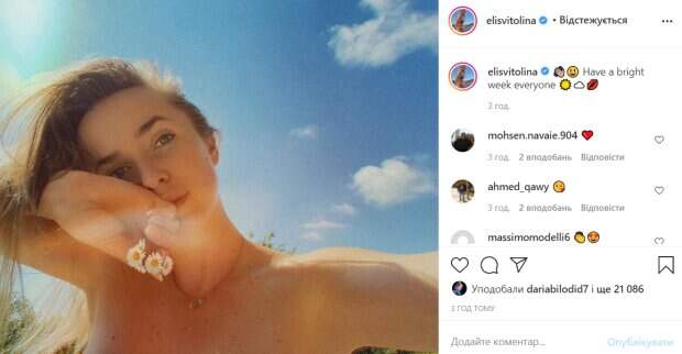На самом деле неизвестно, есть ли на спортсменке одежда, поскольку в кадр попали лишь оголенные руки, плечи и зона декольте. Однако на фото все выглядит так, как-будто Свитолина воссоединилась с природой в чем мать родила. «Всем яркой недели», - подписала фото спортсменка. Добавим, что для фото Свитолина позировала без макияжа, с распущенными волосами. В руках она держала полевые ромашки, что придало снимку особого шарма. «Красиво!», «Сладкая», «Ангелочек», «Сногсшибательная красота», «Прекрасная неделя вернулась к вам!», «Натуральная», «Солнце», «То же самое для вас!», «Да и тебе тоже хорошей недели», «Чао Элина. Целую», - пишут пользователи сети. Ранее мы писали, что Свитолина записала видео для молодежной сети ТикТок. Девушка сидела на стуле в спортивной одежде, после чего за один миг преобразилась в элегантную красотку в маленьком черном платье. Напомним, что Свитолина стала одной из самых дорогих спортсменок планеты: сколько заработала украинка. Как сообщала Politeka, Элина Свитолина в юбке с экстремальным разрезом показала, чем сражает наповал вне корта: «Гарна жінка». Также Politeka писала, что шаловливая Элина Свитолина в экстра-мини подняла ножки, сверкнув лишним: «Невероятно».