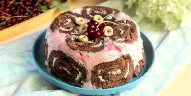 На всю работу уйдет около 30 минут, потом 4-6 часов в холодильнике для застывания. Можно сделать с вечера.[caption id="attachment_49549" align="aligncenter" width="730"] Ингредиенты[/caption] Приготовление Желатин залить половиной стакана воды, а еще лучше - соком или компотом.[caption id="attachment_49551" align="aligncenter" width="730"] Замачивание желатина[/caption]Рулет можно взять любой, но лучше всего подходит шоколадный с шоколадным, банановым или ванильными кремом.[caption id="attachment_49553" align="aligncenter" width="730"] Готовый покупной рулет[/caption]Творог протереть через сито или взбить блендером. Проще взять готовые детские сырки - у них консистенция нежнее.[caption id="attachment_49555" align="aligncenter" width="730"] Творог для крема[/caption]Взбить йогурт и творог в однородную массу. Желатин немного подогреть на водяной бане или в микроволновке, чтобы он растаял. Пюре, если оно с косточками, протереть через сито. На крайний случай можно взять джем. Добавить желатин и пюре и перемешать вручную.[caption id="attachment_49557" align="aligncenter" width="730"] Подготовка крема[/caption]Рулет порезать и выложить в миску, застеленную пищевой пленкой, как на фото. [caption id="attachment_49559" align="aligncenter" width="730"] Выкладывание рулета[/caption]Вылить в миску крем.[caption id="attachment_49561" align="aligncenter" width="730"] Заготовка для торта[/caption]Накрыть и отправить в холодильник на 4 часа минимум. Потом перевернуть на блюдо, снять пленку. Сверху украсьте по желанию. Можно также сделать шоколадную глазурь.Вот какая вкуснятина получилась.