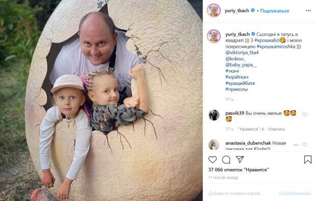 Звезда Студии «Квартал 95» Юрий Ткач умилил поклонников забавным фото с детьми Артист поделился новым семейным снимком в своем Инстаграм, пишет Politeka.net. На фото Ткач позирует со своей дочерью Лизой и крестницей. Они забрались в скульптуру в виде огромного треснувшего яйца. Девочки старательно позируют на камеру, а над ними с улыбкой стоит сам артист.