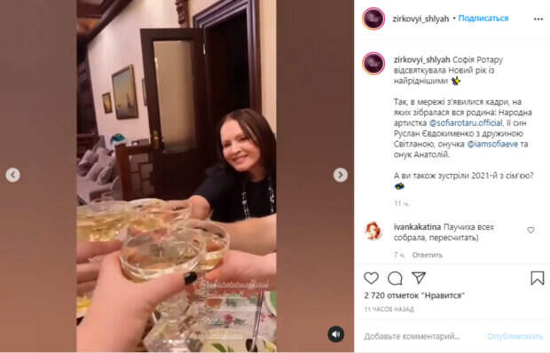 За накрытым столом рядом с ней собралась вся семья: сын Руслан Евдокименко с женой Светланой, внучка Соня и внук Анатолий. "2020 прогуляли!", - радостно объявил тост сын Софии Михайловны, и все дружненько чокнулись бокалами. Но на этом еще не все, тосты, видимо, звучали во время застолья один за одним. На следующих кадрах семейство решило еще раз провести старый год. "Спасибо, что живы!", - поблагодарил Руслан 2020-й. Еще на одном кадре счастливое семейство в полном составе позирует возле высокой новогодней елочки. София Михайловна вместе с сыном уселись на быльце дивана, рядом стояли Соня и Анатолий, а их мама Светлана удобно расположилась в кресле с домашним питомцем на коленях. Все искренне улыбались. У певицы очень близкие отношения со своей семьей. После смерти мужа Ротару в 2002 году, артистка намеревалась уйти со сцены, но сын помог ей вернуться и стал ее музыкальным продюсером. Ротару частенько выкладывает в Инстаграм кадры с родней. Традиционно они отмечают все важные праздники, включая дни рождения, вместе. Так, в полном составе семейство собиралось на 50-летие Руслана. Праздник проходил в ресторане на открытой площадке, утопающей в зелени. Напомним, как "вечно молодая" Ротару выглядит в реальной жизни, кадры из закулисья "Квартал 95": "Начинают вылазить. ..". Как сообщала Politeka, 73-летняя София Ротару покутила в ресторане, шампанское лилось рекой: "Легенду берегите...". Также Politeka писала, что внучка Ротару в черной коже приковала взгляд к расстегнутым пуговкам, жених не сдержал эмоций: "Люблю!".