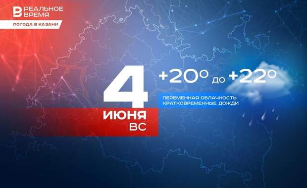 В воскресенье, 4 июня, в Казани ожидается переменная облачность и кратковременные дожди с грозами. Такой прогноз дали в Гидрометцентре Татарстана. Днем воздух в Казани прогреется до +20—22 градусов. В целом по республике ожидается от +18 до +23°С. Синоптики также прогнозируют в Казани северо-западный ветер порывами до 6—11 м/с, утром и днем местами до 15—20 м/с.