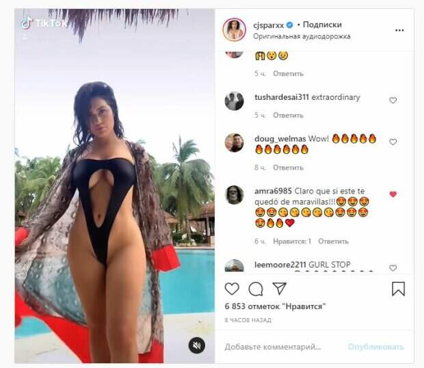 Об этом пишет Politeka.net со ссылкой на страничку знаменитости. "Я не та, кого стоит ждать", - написала звезда под фото. Фанаты поставили почти 7 тысяч лайков и написали комментарии: "Круто", "Вау, ты молодец!", "Прекрасно", "Привет, красавица, отлично, ниже маленького размера, приятно побрилась, мне это нравится", "Какая огненная красотка", "Кошка Гелинда слишком любит", "Выглядит хорошо CJ", "Невероятно выглядит моя принцесса", "Классный купальник", "Они делают это в мужских?", "Нет слов ... просто красиво ...", "Убей его, сестра !!!!", "Довольная богиня, люблю", "Конечно, если бы это было чудо !!!". Сообщалось, что известная мексиканская модель журнала "Playboy" Кассандра Сьенега (CJ SPARXX) впечатлила формами в сверкающем купальнике. "Обалденная" красотка надела в этот раз крохотное бикини, состоящее из треугольных, и другой формы, стеклышек, держащееся на тонких цепочках. Напомним, Кассандра Сьенега из "Playboy" в прозрачном белье дала полюбоваться своими цветочками Также Politeka сообщала, что Кассандра Сьенега из "Playboy" в прозрачном кружеве показала, чем завоевала популярность А еще Politeka писала, что Кассандра Сьенега из "Playboy" в прозрачных трусиках устроила шалости на капоте авто