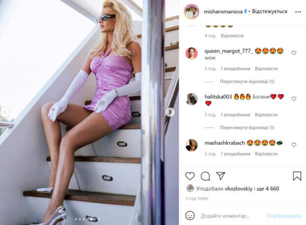 Образ красотка дополнила солнцезащитными очками и белыми длинными перчатками. Стоит отметить, что на некоторых фото ее образ получился весьма откровенным. «Выбираем самое красивое фото», - подписала фото звезда. В комментариях яркой блондинке оставили массу приятных слов. «Ты выглядишь невероятно!», «Все хороши, трудно выбрать», «Нереальная девушка», «Красоточка», «Богиня», «Barbie Girl», - пишут пользователи сети. Как известно, Миша Романова прославилась после того, как попала в состав популярной женской группы «ВИА Гра». Из-за беременности девушка была вынуждена покинуть коллектив. Напомним, что Миша Романова в купальнике с экстра-вырезом впечатлила ярким видом: "Девочка-огонь". Еще Politeka писала, что Миша Романова в мини-платье приковала взгляды к лакомым местам: яркое фото. Также Politeka сообщала, что Миша Романова устроила жару в обтягивающем боди: «Какая мадам».