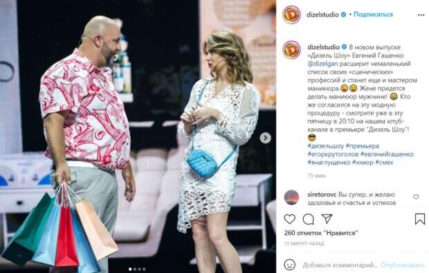 Так, на кадрах Евгений Гашенко предстал в необычном амплуа. На сцене актер изменил профессию и примерил на себя роль мастера маникюра. При этом ему сделали необычную прическу, покрасив часть волос в серебристый цвет. Гостями его салона стали актеры Яна Глущенко и Егор Крутоголов. Что необычно Гашенко придется делать маникюр не Яне, а Егору. "Евгений Гашенко расширит немаленький список своих сценических профессий и станет еще и мастером маникюра. Жене придется делать маникюр мужчине!", - гоаорится в подписи ккадрам. В комментариях пользователи сети оставили немало сообщений. Многие отметили, что с нетерпением ждут нового номера актеров: "Жду", "Побольше нестандартных ситуаций. Безумно интересно. Вы большие молодцы", "Вы супер, и желаю здоровья и счастья и успехов Дизель шоу". Напомним, Виктория Булитко слила в Сеть "компромат" на коллегу по Дизель Шоу. Как сообщала Politeka, звезда "Дизель шоу" Сергей Писаренко нарвался на критику из-за кадров с сыном-подростком. Также Politeka писала, что звезды "Дизель шоу" в ярких вышиванках впечатлили патриотичным признанием: появились кадры.