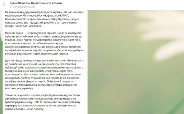 Вскоре украинцы смогут меньше платить за газ по тарифам для населения, в Кабмине уже готовят соответствующее решение Как передает Politeka.net, об этом премьер-министр Денис Шмыгаль сообщил на своем официальном Телеграм-канале. По его словам, глава Минэнерго Юрий Витренко и руководитель НАК "Нафтогаз Украины" Андрей Коболев встретились с депутатами из "Слуги народа" и обсудили проекты снижения цен на "голубое топливо" и его доставку.