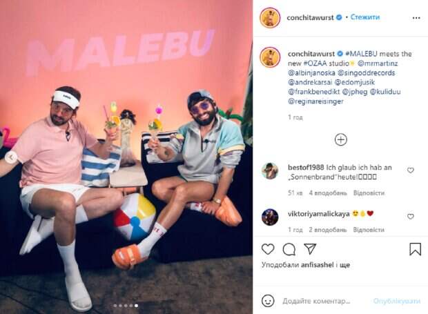 После головокружительного успеха и победы на конкурсе, он покорил сердца миллионов людей по всему миру и продолжает радовать своих фанатов яркими перевоплощениями. Результатами фотосессий Том часто делится в личном микроблоге в Instagram. Так недавно на своей странице Нойвирт выложил забавные летние кадры, на которых позирует вместе со своим другом. Парни в пляжных образах сидят за столиком и наслаждаются яркими коктейлями, при этом видно, что они здорово проводят время в компании друг друга. Но, скорее всего, все это декорации для съемок, а не настоящее свидание. В подписи к публикации Томас написал: "#MALEBU meets the new #OZAA studio". Пользователи тут же принялись активно обсуждать новую публикацию артиста, засыпая его комплиментами и восторженными комментариями. "Замечательные мальчики", "Спасибо за этот вечер на пляже в вашей студии с Томом, Мартином и всей командой. Благодаря вам действительно наступило лето. Веселые и солнечные наряды, мальчики и что за настроение! Удачной вам недели и до встречи на следующей неделе", "Вчера был такой чудесный день. МАЛЕБУ, ОЗАА, твоя студия и наряды, наполненные летней атмосферой. Всем спасибо и хорошего воскресенья", - пишут фанаты в комментариях к фото. Напомним, Звезда «Евровидения» Кончита Вурст в женском купальнике показала, в чем проведет лето: «Так противно…». Как сообщала Politeka, Звезда «Евровидения» Кончита Вурст удивила видом в повседневной жизни: кадры перевоплощения. Также Politeka писала, Звезда "Евровидения" Кончита Вурст покорила образом для летней жары: "Шорты короче самых коротких...".