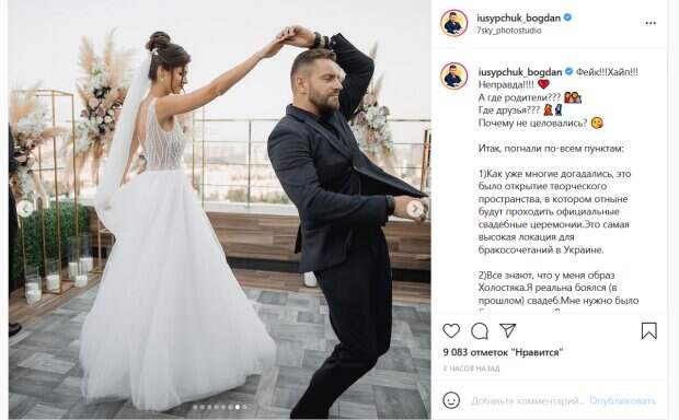 Пара опубликовала в своих соцсетях кадры с торжественной церемонии, на которой Богдан был в классическом костюме, а Юлия – в белоснежном платье с фатой. «Возлюбленные» до последнего делали вид, что это было по-настоящему, однако 28 июля они сделали неожиданное признание. Как пишет Politeka.net, в своих Инстаграм Богдан и Юля рассказали, что их не связывают романтические отношения, а их «свадьба» - была просто рекламой новой локации для праздников. Юсипчук также заявил, что якобы боялся свадеб, поэтому хотел победить этот страх, а Юля надеялась, что если проведет «свадебную репетицию», то сможет в течение двух лет выйти замуж, как гласит поверье. Кроме того, пара связала такой пиар ход с раскруткой приюта для бездомных животных. Впрочем, многих украинцев аргументы Богдана и Юлии не впечатлили. «Что не сделают для пиара, я в шоке ждём следующую серию с постановочными родами.», «Кажется, у некоторых людей нет границ для хайпа», «Сейчас такие чувства как будто в тебя плюнули. Обидненько как то…», «Господи, не знают уже как денег заработать», «Точно так было в холостяке) игра и пафос. Миша молодец, что не купился», - пишут люди. Напомним, Юля "Зайка" после неожиданной свадьбы с ведущим "1+1" призналась, беременна ли она. Как сообщала Politeka, свадьба финалистки "Холостяка" Юли "Зайки" с известным ведущим, выяснилась правда. Также Politeka писала, что "Зайка" из "Холостяка" сыграла свадьбу с "самым красивым мужчиной мира", кадры уже в сети.