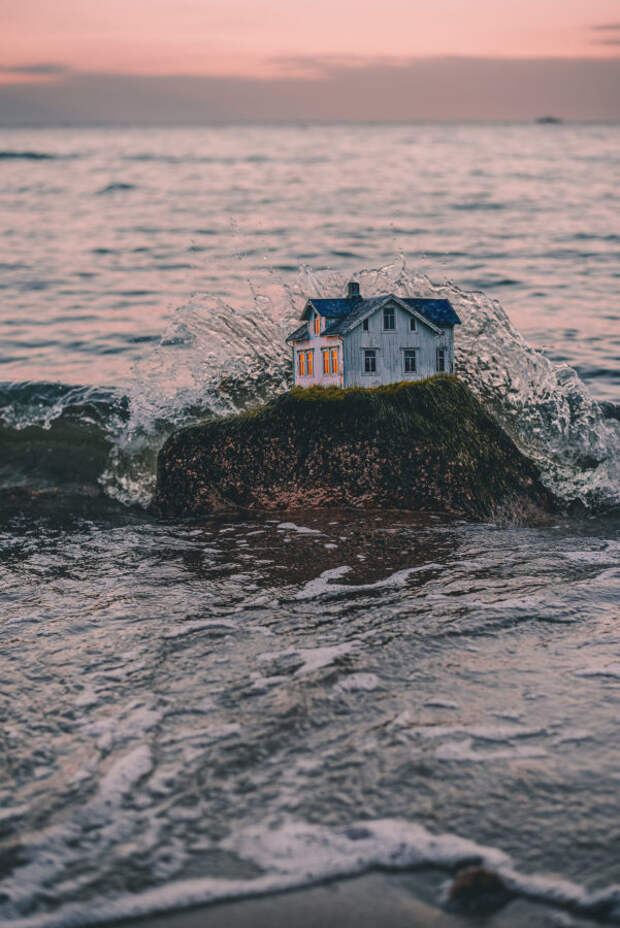 Здравствуй! Я Марселина, и я строю дома. Под сборкой я подразумеваю, что редактирую их в фотографии. В деревья, сундуки, тыквы, на камни и облака. Я даже построила крошечный домик Хоббита под мхом. С COVID разразился ад, и я застряла в своей квартире, я мечтала оказаться в другом месте. Потом дома стали появляться из моих снов в фотографиях.