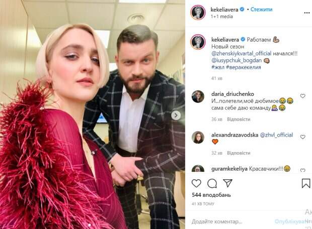 Известная актриса Вера Кекелия, звезда "Квартал 95" показала новые кадры со съемок Об этом сообщает Politeka со ссылкой на страницу Кекелии в соцсети. Так, в аккаунте артистки появились фото и видео со съемок нового сезона "Женского Квартала". На фото она позирует вместе с актером Богданом Юсипчуком.