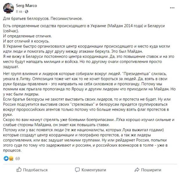 в Украине быстро организовался центр координации протестующих и место, куда могли идти люди и помогать друг другу между атаками со стороны "беркутовцев" - это был Майдан независимости. Тем временем в Беларуси постоянного центра координации нет, а без него все очаги сопротивления "просто задушат". Кроме того, Беларусь не имеет лидеров, которые собирали бы вокруг людей. Главная конкурентка Лукашенко Светлана Тихановская "слилась" и уехала в Литву. "Если братья белорусы не захотят выставить своих лидеров, то и протеста не будет", - написал блогер. Также он прогнозирует, что скоро по участникам протестов начнут стрелять уже боевыми боеприпасами. "Лука хорошо изучил сильные и слабые стороны Майдана, он знает, как повышать ставки. Поэтому или у вас появятся люди (те же националисты, которых Лука выжигал годами), которые создадут центр координации и географию протестов, а так же лидеры сопротивления, или вас задушат мелкими группами", - считает Карпюк. Напомним, "Этого он боится больше всего": восставшие белорусы Лукашенко отомстят новым способом, раскрыты планы на 11 августа. Как сообщала Politeka, взрывы не умолкают, каратели Лукашенко стреляют без разбора: Беларусь захлестнула вторая волна Майдана, кадры с места событий. Также Politeka писала, что возле резиденции Лукашенко заметили подозрительную активность:"очень странные дела".