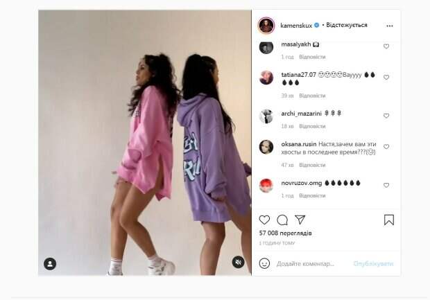 При этом на ноги ничего, кроме кроссовок и носков, судя по фото, они не надели. Каменских надела розовую кофту, тогда как Анна предпочла фиолетовую. Образы они дополнили аксессуарами и игривыми хвостиками на голове. Каменских ранее рассказала, что запускает совместно с Завгородней линию одежды. Похоже, девушки решили сделать яркую презентацию, лично примерив необычные наряды. Горячие кадры бурно встретили в Сети, однако такую одежду оценили не все. «Девчонки, вы носите такие кофты? Мне кажется, что они удобны дома или на даче, природе. А так на такую кофту и куртка не налезет», «Настя, зачем вам эти хвосты в последнее время?», «Куда можно выйти в такой кофте, или как это правильно называется, ужас, рукава висят, длина непонятная», - пишут в комментариях. Анна Завгородняя (Андрийчук) работала на телевидении, позже стала дизайнером, развивает собственный бренд модной одежды. С Позитивом она познакомилась в 2006 году. Поженилась пара в 2013 году. Напомним, бесстыжая Каменских с высунутым языком пококетничала на камеру, выпячивая декольте: "Девочка играется" Как сообщала Politeka, Каменских со своими "выходками" взбесила украинцев, досталось и Потапу: "Уже не девочка, пора рожать" Также Politeka писала, что Каменских расплакалась, уехав от Потапа с подругой, тайна расставания раскрыта: "Я поняла, что нужно. .."