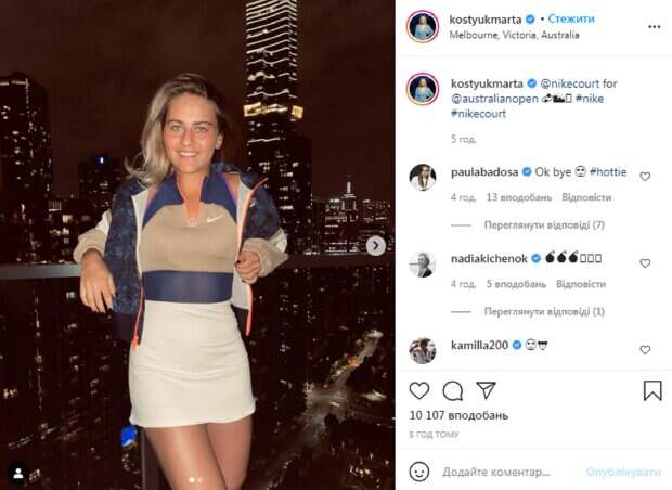 Девушка прогуливалась в спортивном коротеньком платье и куртке. Она также указала геолокацию - фото было сделано в Австралии. В комментариях Марту засыпали комплиментами, не сдерживая эмоций. "Ммм горячая", "Горячая девочка", "Наша чемпионка", "Мило", "Модель", "Талантливая и красивая тоже, редкая комбинация", "Невероятная", "Прекрасно выглядишь", "Просто красавица", "Не могу тобой налюбоваться", "Такая искренняя улыбка", "Ты шикарная", "Чудесного вечера тебе, красавица", - пишут в комментариях. Ранее мы рассказывали, что восходящая звезда украинского тенниса Марта Костюк в первом поединке на US Open не оставила шансов россиянке Дарье Касаткиной в двух сетах. Матч закончился победой Украинки со счетом 6:1, 6:2. Отметим, что российские эксперты считали, что россиянка легко сможет одержать победу над представительницей Украины, поскольку Марте Костюк якобы "не хватает опыта". Напомним, что Марта Костюк рассказала, как ночевала с людьми на Майдане А еще Politeka писала, что украинка выиграла престижный турнир по теннису Также Politeka сообщала, украинские теннисистки уничтожили соперниц в решающем поединке