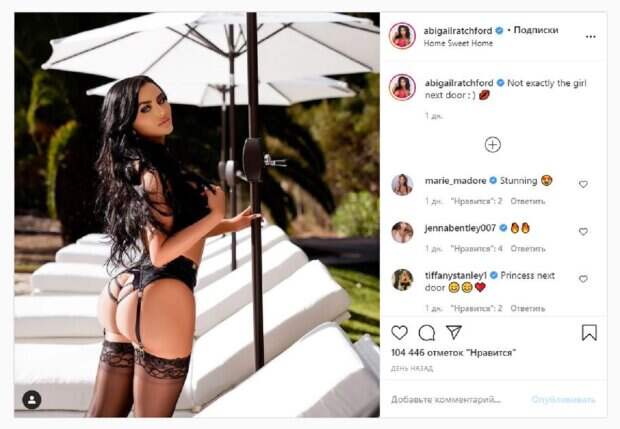 Об этом пишет Politeka.net со ссылкой на страничку знаменитости. "Не совсем та девушка по соседству; )", - написала красотка. "Я стараюсь не упрощать", "Только соседка, если ваш почтовый индекс...", "Почему в следующем году нет календаря ??", "Вау, детка, ты его убиваешь", "Я бы хотел жить по соседству с тобой!", "Просто вау ты выглядишь просто великолепно", "Ты можешь быть рядом со мной", "Но мы можем ПОЖЕЛАТЬ, что ты была девушкой по соседству! Яркое фото!", "Абсолютное потрясающее зрелище", "Абсолютно потрясающая, великолепная и безупречная малышка". Сообщалось, что американская модель Эбигейл Рэтчфорд решила устроила соблазнительную фотосессию прямо в душевой. Девушка начала рекламировать нижнее белье популярных брендов несколько лет назад и прославилась довольно быстро. Теперь Эби также начала сниматься для мужских журналов, кадры со съемки также попали в сеть и быстро набрали сотни комментариев в адрес Рэтчфорд. Напомним, разгоряченная Деми Роуз приковала взгляды к упругому "орешку" в леопардовом корсете А еще Politeka писала, что Эби Рэтчфорд дала взглянуть на свои упругие формы в полупрозрачном боди Также Politeka сообщала, что хозяйка самых красивых ягодиц показала все пикантности в наряде Санты