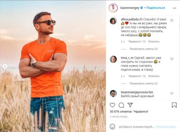 Лазарев вышел в поле ради сочных снимков. Знаменитость стоял почти по пояс в высушенной траве. На нем была оранжевая футболка и синие джинсы. "Над пропастью во ржи...