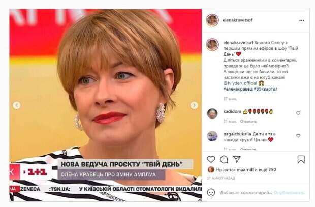 И вот долгожданный первый эфир прошел, о чем сразу написали на одной из фан-страничек в Инстаграм. "Поздравляем Елену с первым прямым эфиров в шоу "Твой День" Делитесь впечатлениями в комментариях, правда это было невероятно ?! А если вы еще не видели, то все части уже есть на ютуб-канале", - написано под публикацией. На фото, которые добавлены были в публикацию, Елена была в полосатой кофте и со стильными серьгами. Девушка смеялась, впечатляя белоснежной улыбкой. Фанаты, включая дочь Кравец, поставили сотни лайков и написали комментарии: "Где ты - там всегда круто! интересно", "Видела все, такую актуальную тему Елена задела, просто слов нету. Человек глубина, человек душа, человек позитив, Елена Кравец, сделала этот эфир невероятно дружественным и теплым. Шикарно, уже жду еще", "Леночка, ты красотка", "Чем бы Лена не занималась улыбка всегда с ней". Напомним, Кравец из «Квартал 95» рассекретила свою новую работу, поделившись впечатлениями Также Politeka сообщала, что Горбунов не устоял перед Кравец из "Квартал 95" в прозрачном платье А еще Politeka писала, что "Беременной" Елене Кравец пришлось разнимать Евгения Кошевого и Ткач