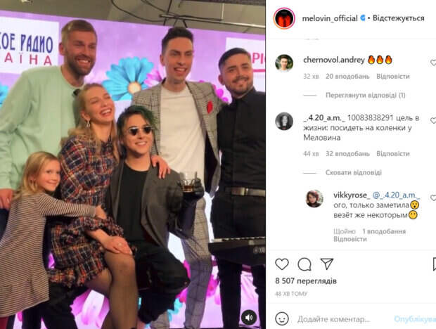 На видео MELOVIN позировал для фото с другими людьми. На руках у него сидела звезда «Женского квартала» и проектов «Квартал 95» Лера Товстолес. Она томно прижалась к артисту, что привело в недоумение многих фанатов. Также для фото позировал экс-участник шоу «Холостячка» Андрей Рыбак и другие мужчины. В комментариях, впрочем, обсуждали только девушку на коленях у артиста. «Цель в жизни: посидеть на коленках у Меловина», «везёт же некоторым», «Вау! Девчонки, кто хотел бы побыть на коленках у Мела на месте той девушки?», «Ревность вошла в чат», «Ждём заголовки о том, что у Мэла шведская семья-гарем», «Такие классные», «Лера и Мел - тандем века», - пишут пользователи сети. Ранее мы писали, что MELOVIN впечатлился от песни Тины Кароль и показал, как напевает ее по утрам. Судя по всему, певцу очень зашла новая композиция коллеги. «Если просыпаться, то только так. Пахнет весной. Настроение огонь», - подписал сторис артист. Напомним, что эпатажный фаворит Данилко MELOVIN забыл о пении, удивив новым "амплуа": "Облизываюсь!". Ранее мы писали, что фаворит Данилко MELOVIN показал, с кем просыпается счастливым: "Доброе утро". Также на Politeka сообщали, что любимчик Данилко MELOVIN ошарашил королевскими замашками: "О, Dragon King".
