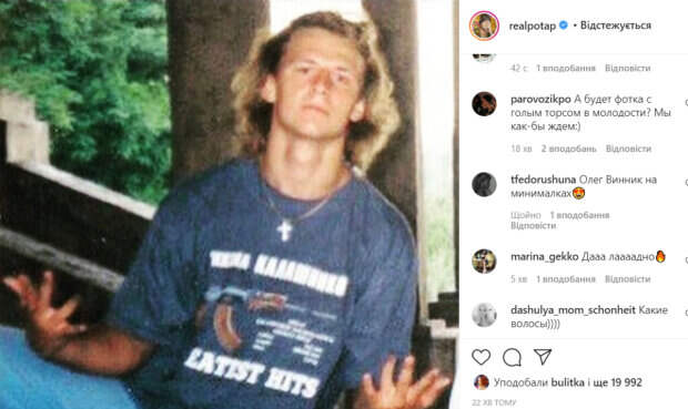 В комментариях поклонники и коллеги Потапа стали обсуждать имидж артиста в молодости. Кроме этого, они начали сравнивать его с разными артистами и зарубежными звездами. «Жесть конечно», «Похож на Мэтью Макконехи», «Вам идёт с волосами))) как из сериала Район Беверли Хиллс», «На этой фото на Юрка Юрченка похож:))», «Как же вашим с Настей детям повезёт с волосами, раз у обоих такая шевелюра роскошная», «Олег Винник на минималках», «Оооооо!!!! Ты прекрасен», - пишут пользователи сети. Стоит отметить, что большую часть своей карьеры Потап предпочитает носить короткую стрижку. Еще чаще он бреет голову. Именно поэтому фото с длинными волосами вызвало столько эмоций у подписчиков артиста. Ранее мы писали, что в сети опубликовали кадры, на которых Потап делает предложение Насте Каменских. Как известно, пара долгое время скрывала свои отношения. Напомним, что Потап в деловом костюме ошарашил сходством во внешности с Кошевым из "Квартал 95": "Ну прям братья...". Как сообщала Politeka, Потап в модном бутике внезапно решил рассказать украинцам, как надо жить: «Тяжело? Сделайте...». Также Politeka писала, что 39-летний Потап засветил полный рот брекетов, Дорофеева в восторге: "Зри!".