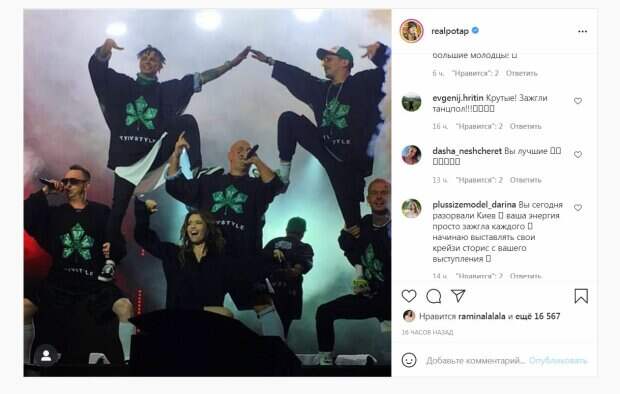 "Взяли Бабу В Мужской клуб! На один раз! Но зато какой! Спасибо @atlasweekend спасибо Киев!! Это @mozgiband we Done! It was Powerful!!! #mozgi @nadyadorofeeva", - написал Потап в посте, на фото можно заметить и Позитива. Публикация собрала более 16 тысяч лайков и много комментариев. "❤️❤️❤️❤️❤️❤️❤️❤️❤️❤️❤️❤️❤️❤️", "Ребята, ну что за изображение на футболках, ай яй яй)))", "Какая к чёрту баба?", "А почему поцелуй был без Нади?