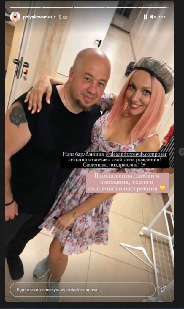 Мужчина был в черной футболке и хвастался бицепсом, обнимая в ответ Олю. Об этом пишет Politeka.net со ссылкой на страничку знаменитости. "Наш барабанщик Александр сегодня отмечает свой день рождения!. Сашенька, поздравляю", - написала звезда под фото. "Вдохновения, любви и внимания, тепла и солнечного настроения", - пожелала Оля Александру. Фанаты не ставили лайки и не писали комментарии, так как Оля выбросила кадр в сторис Инстаграм, где подобных функций нет. Мы писали, что украинская певица Оля Полякова публично извинилась перед Тиной Кароль после нелестных высказываний в ее сторону. У себя в Инстаграм артистка опубликовала видеообращение, в котором принесла свои извинения за высказанное мнение. Как известно, во время последнего эфира шоу "Маска" Полякова назвала Тину Кароль "известной плакальщицей на похоронах". Напомним, Полякова прямо с самолета угодила к врачу, кадры А еще Politeka писала, что эффектная мать Поляковой показала, как выглядела в молодости, редкие кадры Также Politeka сообщала, что безудержная Полякова в красном экстра-мини затмила Кухар и Ефросинину