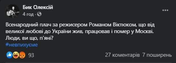 Так, представитель 13 запасного батальона ДУК "Правый сектор", журналист, публицист и блогер Алексей Бык удивился скорби соотечественников по режиссеру. "Всенародный плач за режиссером Романом Виктюком, что от большой любви к Украине жил, работал и умер в Москве. Люди, Вы что, пьяные?", - написал он на своей страничке в Facebook. А лидер радикальной группы "Братство" Дмитрий Корчинский отметил, что не видел ни одного спектакля Виктюка, но не сомневается в его таланте. "Семь лет московской военной агрессии против его Родины он продолжал жить в Москве, продолжал в московских театрах ставить московские спектакли для московитов. Может хорошо, что умер?", - поинтересовался Корчинский. Реакция на его пост была двоякой: "По моему мнению слишком нагло господин Дмитрий написал. Хорошо когда человек живет. Не вы, господин Дмитрий, дали жизнь Роману Виктюку, не радуйтесь его смерти. Мы все под Богом ходим. Тарас Григорьевич Шевченко родился в Украине, а умер в России. Писал и на том и том языке. Но остался в сердцах людей великим Кобзарем", "Что был, что не было! Как-то так", - писали в комментариях. А вот Ирина Белоконь, которую все знают как "маму Верки Сердючки", до сих пор оплакивает украинского режиссера в своем микроблоге. "Много можно писать, но слёзы мешают.....", - говорится в подписи к совместному снимку Романа Виктюка с Андреем Данилко. Известно, что официальная церемония прощания с легендарным режиссером состоится в Москве, а похоронят его на родине, во Львове. Напомним, Виктюк призвал жителей Донбасса задуматься, где их родина Как сообщала Politeka, Печальный Данилко поделился большим горем, откровенное признание звезды Также Politeka писала, что Ушел из жизни легендарный режиссер Виктюк: что он говорил об Украине и Донбассе