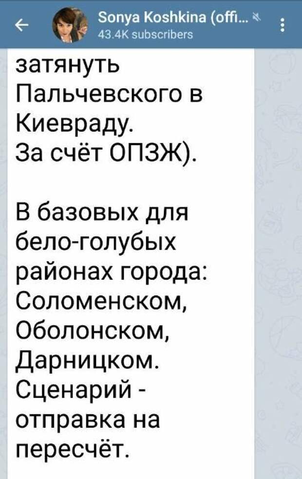 5 Притула 7.8 Кучеренко 6.3 Верещук 5.4 Пальчевский 5.3 Горсовет Удар и ЕС по двадцать процентов. Разница — в несколько сотен голосов. Мандатов будет поровну Єдність — 8.6 (старые сетки — штука серьезная) ОПЗЖ — 7.7 Батькивщина — 7.4 СН — 7.4 (первый раз, на моей памяти, партия власти аж на шестом месте в городе) Голос — 5.9 А вот теперь интересно. Потому что у Пальчевского 4.4 То есть, в Киевсовет эта политсила не заходит. Так вот. В данный конкретный момент дана команда любыми правдами и неправдами затянуть Пальчевского в Киевраду. За счёт ОПЗЖ. В базовых для бело-голубых районах города: Соломенском, Оболонском, Дарницком. Сценарий — отправка на пересчёт. Так мило, правда?) Интересно, мажоритарные акционеры ОПЗЖ — Левочкин, Бойко, Рабинович — эту схему благословили?) Дружеская взаимопомощь, так сказать).