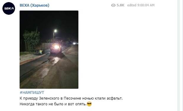 В сети показали, как на Харьковщине готовились к приезду президента Украины Владимира Зеленского Как передает Politeka.net, соотвтетственные снимки появились на Telegram-канале ВАХЕ. Кадры были сняли в поселке Песочин под Харьковом. "К приезду Зеленского в Песочине ночью клали асфальт. Никогда такого не было и вот опять", - говорится в подписи к снимку.