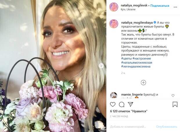 При этом звезда решила оставить в секрете, от кого получила такой букет. «А вы что предпочитаете живые букеты или вазоны? Так жаль, что букеты быстро вянут. В отличии от комнатных цветов в горшочках. Цветы, подаренные с любовью, пробуждают в женщине нежную, ранимую и наивную девчонку!)», - написала артистка в подписи к фото. Ее поклонники тут же принялись комментировать новый пост. «Красивая», «Наталья вы красотка! Вы живой цветочек, дарящий вдохновение для других! Будьте всегда такой жизнерадостной!!», «Красотка, улыбайся всегда», «Наташка ты хороша», «Я тоже хочу Вам пожелать в скором времени деток, будьте счастлива Наша дорогая Наташа», «Наташа, Вам очень идёт улыбка! Улыбайтесь всегда и будьте счастливы!», «Букеты, а глаза обалденные, влюбленные», - пишут люди. Ранее мы писали, что популярная украинская певица Наталья Могилевская пришла на светское мероприятие в ночнушке с миллионером. Показ Могилевская посетила с киевским бизнесменом Олегом Рыжовым. Это был не первый их совместный выход в свет. Хотят разговоры, что красавчик не просто друг Натальи, но певица все слухи отрицает. Напомним, Могилевская на фоне слухов о романе с миллионером поделилась постельным фото. Как сообщала Politeka, довольная Могилевская в платье с вырезом посветила самым интересным. Также Politeka писала, что Могилевская дерзко опустила украинских гастролеров в РФ, видео.