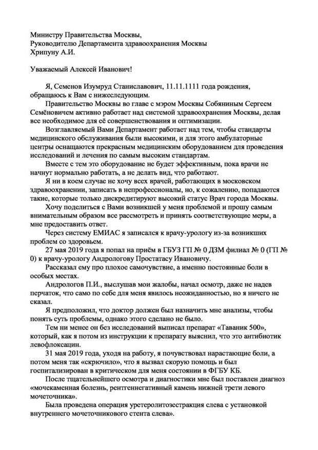 Министру Правительства Москвы, Руководителю Департамента здравоохранения Москвы Хрипуну А.И. Уважаемый Алексей Иванович! Я, Семенов Изумруд Станиславович, 11.11.1111 года рождения, обращаюсь к Вам с нижеследующим. Правительство Москвы во главе с мэром Москвы Собяниным Сергеем Семёновичем активно работает над системой здравоохранения Москвы, делая все необходимое для её совершенствования и оптимизации.