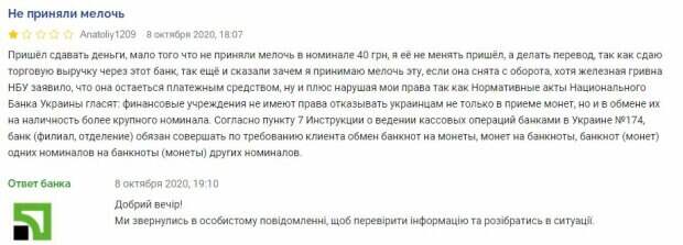 "Ещё и сказали, зачем я принимаю мелочь эту, если она снята с оборота, хотя железная гривна, НБУ заявил, что она остается платежным средством, ну и плюс нарушая мои права, так как, нормативные акты Национального Банка Украины гласят: финансовые учреждения не имеют права отказывать украинцам не только в приеме монет, но и в обмене их на наличность более крупного номинала", - рассказал клиент в своем негативном отзыве. "Добрый вечер! Мы обратились в личном сообщении, чтобы проверить информацию и разобраться в ситуации", - ответил на жалобу сотрудник ПриватБанка. О похожей ситуаци, помимо этого, сообщают в Мелитополе, где украинцам отказывают в обмене монет при условии, если они якобы не "авторизированы" в ПриватБанке, передает портал MV.org.ua. Как известно, в ПриватБанке украинцы до 2023 года могут обменять: банкноты номиналом 1 и 2 гривен образцов 2003-2007 годов, а также образцы купюр до 2003 года. А вот клиентам обмен проводят без проблем. Для этого нужного назвать номер своего телефона или предоставить любую карту для идентификации. Меняют деньги на действующие банкноты и монеты национальной валюты всех номиналов, в суммах кратных 10 копейкам. В ПриватБанке также напомнили, что существует ограничение на прием таких денег: на одного клиента сумма до 200 грн монетами и до 1000 грн банкнотами. Напомним, масштабный возврат денег украинцам на карточки ПриватБанка, заявление Минфина. Как сообщала Politeka, украинцев защитят от штрафов за невыплату кредитов, в НБУ озвучили новые правила. Также Politeka писала, что ПриватБанк срочно предупредил украинцев о новых проблемах.