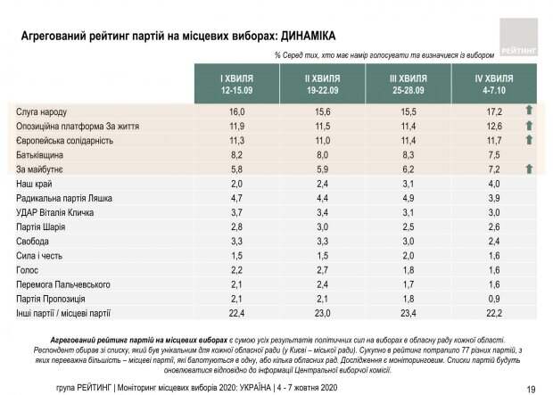 Практически все эти политсилы за последнюю неделю улучшили свой результат. По данным опроса партию "Слуга народа" поддерживают 17,2% тех, кто определился и намерен прийти на выборы, "Оппозиционная платформа - За життя" - 12,6%, "Европейская солидарность" - 11,7%, "Батькивщина" - 7,5%. Кроме того, партию "За майбутне" поддерживают 7,2% респондентов, "Наш край" - 4,0%. Радикальную партию Олега Ляшко - 3,9%, УДАР Виталия Кличко - 3,0%, партию Шария - 2,6%, ВО "Свобода" - 2,4%, партии "Голос", "Перемога Пальчевского", "Сила и честь" - по 1,6%, партию "Пропозиция" - около 1%. Суммарный рейтинг других партий (в основном местных), которые принимают участие в местных выборах и были включены в список для исследования, - 22,2%. Опрос проведен Социологической группой "Рейтинг" 4-7 октября 2020 года среди 5000 респондентов по всей Украине за исключением оккупированных Россией территорий. Метод исследования: личное формализованное интервью (face-to-face). Ошибка репрезентативности исследования: не более 1,4%. Отметим, по данным опроса Социологической группы "Рейтинг", проведенного 25-28 сентября, рейтинг партий перед местными выборами возглавляли четыре парламентские партии. Напомним, по данным опроса Социологической группы "Рейтинг", только 35% украинцев знают точную дату местных выборов в Украине. Еще 43% респондентов вообще не знают, когда состоятся выборы, 19% знают, что где-то в октябре, но даты не знают, а 3% назвали неправильные даты.