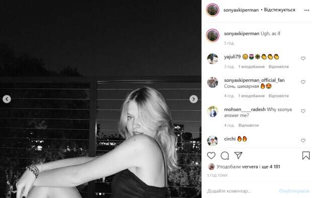 «Тьфу, как будто», - подписала снимки Соня. За несколько часов ее пост собрал более 4 тысяч лайков. Оценила фото и мама девушки, певица Вера Брежнева. В комментариях ей оставили массу комплиментов. Не обошлось и без сравнения с мамой. «Сонь, шикарная», «Какая красивая, интересная девушка», «Красавица», «ДНК красоты мигрирует», «Вся в маму красотка», «Вау. Очень красивая, как и Вера Брежнева», - пишут пользователи сети. Ранее мы писали, что Соня сверкнула фигуркой в откровенном купальнике. Красотка выбрала бикини с леопардовым принтом, которое подчеркнуло стройную фигуру Сони. Она лежала на полу, соблазнительно выгнувшись. «Красивая Соня», «Очень красиво», «Какие красивые бёдра!!!», «Вау, шикарная», «Хороша», - оставили девушке кучу комплиментов под фото. Также недавно Киперман поделилась снимком в белом халатике. Девушка разлеглась на кровати, приняв очень соблазнительную позу. Напомним, что Соня Киперман в купальнике нагнулась слишком низко: "Даст маме фору". Как сообщала Politeka, Соня Киперман восхитила нежной красотой в пикантной блузке, мама оценила. Также Politeka писала, что Вера Брежнева ошарашила словами о дочери и своей роли бабушки: "Весной ей исполнится...".