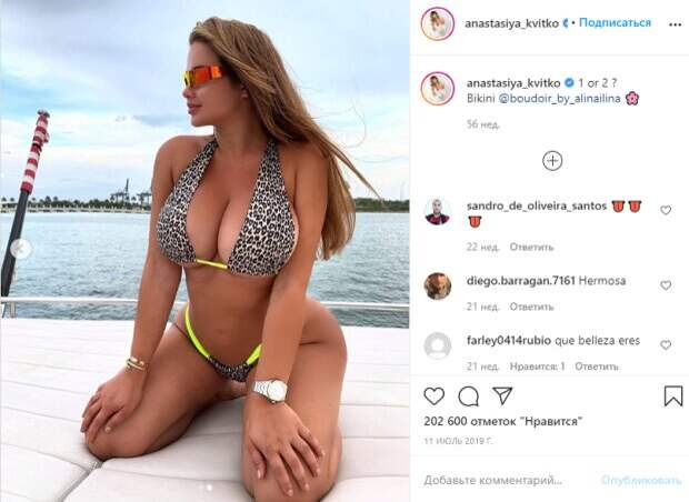 Отказавшись худеть, модель нашла успех именно как представитель одежды, а ее страница в ИНстаграм все еще набирает свою многомиллионную аудиторию. Причем девушка не любит, когда ее сравнивают с Ким Кардашьян, "скромно" заявляя, что она намного лучше. В этот раз на фото девушка показала модное бикини с леопардовой расцветкой и кислотного цвета тоненькими лямочками, едва удерживающими ее объемные формы. «Прекрасный вид», «какая ты красавица», «У тебя очки баканес, и ты очень красивая», «прекрасная, небо с неба выпускает звездную пыль», «Вкусная и изысканная дамочка», «Пожалуйста, больше пятнышек», «Слишком богатая мамочка», «Нет ни одной твоей фотографии, которая бы не перестала быть такой божественной, поэтому мне все они нравятся, потому что во всех есть только одна Анастасия, которая существует в этой жизни, которая, конечно, единственная, которая мне нравится больше всего. 🌹🌹🌹😘», «Омг красивое тело», «Где твой пупок?!? 😮», «Вау очень шикарно 😍», «Ваше тело непревзойденное сияние. 🔥🔥🔥», - пишут фанаты. Также мы писали, что больше всего в профиле Насти в Инстаграм можно увидеть фото из отдыха, сделанных на пляже, или же кадры из постановочных фотосессий. Преимущественно, на снимках девушка без стыда демонстрирует свое тело в одних кружевах или едва заметном белье и купальниках. Поэтому новое фото в профиле Квитко, на котором она позирует в скромном топе с глубоким декольте и длинной юбке небесно-голубого оттенка в крошечный цветок вызвало бурю в сети. Комментаторы принялись массово удивляться образу Насти, показавшей свои розы, возле которых она и позировала. «Просто выглядит глупо», «Поздравляю 🎉», «Твои формы просто для развлечения», «Вместо тысячи слов», «Декольте глубже и глубже🔥», «ты чудесная милая леди 😘 😍🔥🌹👑❤💋💙», «Лучшая модель 👏», «Прекрасная королева заслуживает цветов 😍❤️😍❤️». Напомним, что Анастасия Квитко не удержала сочные формы, натянув слишком маленькое бикини: "Это просто мед!". А еще Politeka писала, что Анастасия Квитко показала свою «ким» в откровенном купальнике: «Вау, светится». Также Politeka сообщала, что Анастасия Квитко подразнила пышными "пончиками" в одной сеточке и кружевах: топ "вкусных" образов.
