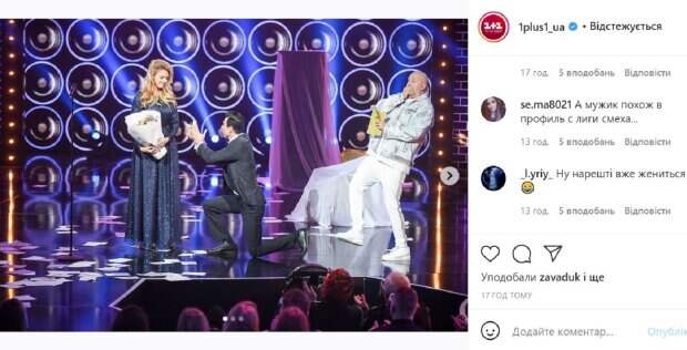 В паблике пишут: "Лесе Никитюк признались прямо на сцене проекта "Липсинк батл". Зрители увидят ожесточенный батл телеведущей Леси Никитюк в образе Адель и певца Павла Зиброва в роли Фредди Меркьюри. Леся воплотит на сцене один из выступлений легендарной Адель, "залипсив" ее хит Hello. А после выступления певицу ожидал огромный сюрприз - признание на сцене, кольцо и предложение руки и сердца", - заинтриговали авторі паблика. На фото, иллюстрированных пост, - "располневшая" телеведущая с букетом цветов, перед ней на колене мужчина с кольцом в руке, и "ошарашенный" Потап, который демонстрирует "удивление". На одной из фото Леся смахивает слезу, от неожиданности. Поклонники неоднозначно прореагировали на фото, написав множество комментариев. Одних повеселил номер с кольцом, другие восприняли "предложение руки и сердца" всерьез, а внимательные телезрители подметили, что мужчина с кольцом появляется на всех проектах и предлагает руку и сердце незамужним девушкам. Недавно он просил руки и сердца на "Лиге смеха", написали поклонники. Сама же Леся Никитюк оставила под постом веселіе смайлики: "