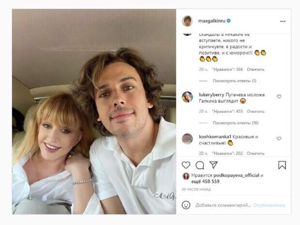 Не забывают Максим и Алла о социальных сетях, в которых делятся кадрами из обычной жизни. На новом селфи, которое опубликовал Галкин, парочка сидела в автомобиле. Алла улыбалась, пока Максим делал фото. Фанаты поставили сотни тысяч лайков и написали комментарии: "Пугачева моложе Галкина выглядит", "Никаких скандалов на показуху, столько лет вместе, замечательные, воспитанные детки, всегда приятно смотреть", "Макс, ты большой молодец, настоящий мужчина, посадил дерево, построил дом и сделал детей. Береги Аллу", "Ого.Алла Борисовна выглядит моложе Галкина", "Прелесть. Дай бог здоровья и счастья всей вашей семье". Сообщалось, что примадонна Алла Пугачева удивила внешним видом на новом фото с маленькой дочкой. На фотографии Алла Борисовна позирует сидя на стульчике и держа на руках маленькую Лизу. Перед камерой артистка появилась в простом черном платье с белоснежным воротником. Ее волосы небрежно уложены, а на лице легкий макияж и милая улыбка. Напомним, 72-летняя Пугачева показала себя в платье-мини и пожалела А еще Politeka сообщала, что 72-летняя Пугачева с обнаженными плечами напугала своим видом Также Politeka писала, что дочь Пугачевой Орбакайте не узнали на детском фото, как выглядела будущая звезда