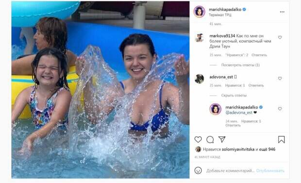 В частности, Маричка опубликовала фото с дочерью в аквапарке. Ведущая блеснула фигурой в купальнике, брызгаясь голубой водой. В посте Падалко поделилась отзывом о месте отдыха, где побывала. По словам звезды, ее детям очень понравилось в аквапарке и они бегали на горки "В общем, я бы поставила аквапарка 7 из 10. Бал бы точно сняла за ужасную русскую музыку в районе бара, которую, к счастью, почти не слышно из-за шума горок и воды. В общем, если давно не были в таких местах, то «заходит» хорошо