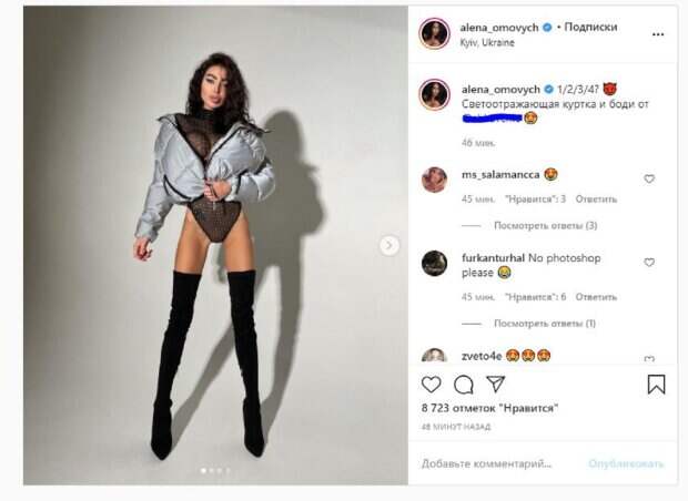 Известная модель Алена Омович, которую называют украинской Кардашьян, показала себя в провокационном образе На фото красотка стояла в куртке, ботфортах, прозрачном боди и куртке. Последнее звезда сбросила ко второму снимку. Девушку не смущала прозрачность наряда и она хвасталась самыми аппетитными местами в разных позах.