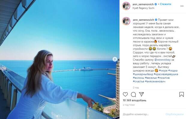 40-летняя певица Анна Семенович не перестает эпатировать публику пикантными выходками Как передает Politeka.net, звезда опубликовала свежие фото в своем микроблоге в Инстаграм, на которых предстала в слегка растрепанном виде, ненакрашенной, но зато очень счастливой. Так, Анна позировала на балконе отеля в Сочи, в двух шагах от Черного моря.