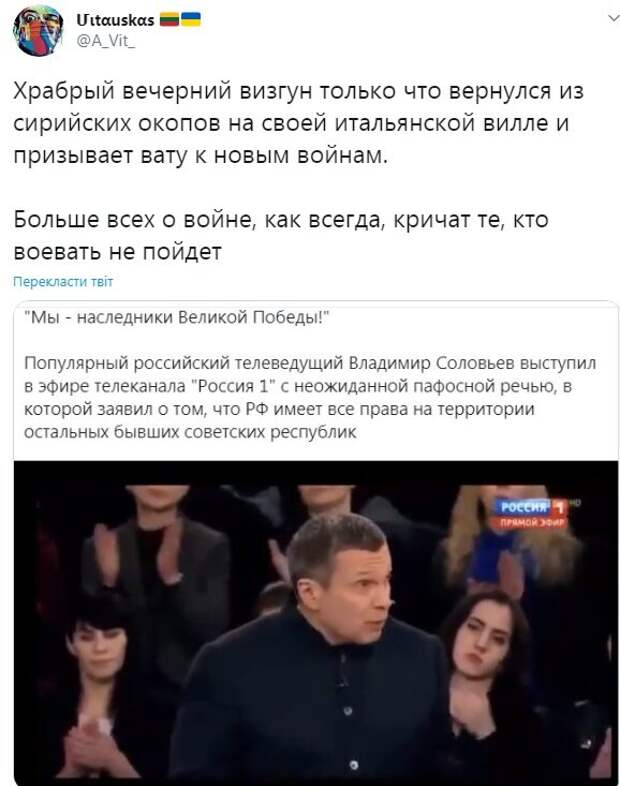 "Храбрый вечерний визгун только что вернулся из сирийских окопов на своей итальянской вилле и призывает вату к новым войнам. Больше всех о войне, как всегда, кричат те, кто воевать не пойдет", - говорится в комментарии к заявлению Соловьева. Следует отметить, что в неожиданной пафосной речи Соловьева в очередной раз прозвучали слова о "наследниках великой победы". В комментариях иронизировали по поводу такого заявления российского пропагандиста, намекая на нездравый рассудок Соловьева. "Мажозвон вконец сошел с ума", "Больной му*озвон работает у еще более больного обнуленного бункерного", "**ать он болен", "Воевать он пойдет, и звание получит, и награды. Не в пехоте, конечно, а в более важном месте, типа росинформбюро", "Он не сошел с ума, ему приказано это сказать. Видимо, готовятся к войне. И народ постепенно готовят к этому. Крыму без воды (канала) п***ц! А воду добыть только войной", - пишут в комментариях. Напомним, депутат Госдумы прославился после заявления об атаках США по РФ, видео. Ранее Politeka писала, что "Хабаровск - это Украина": скандальный Соловьев увидел "руку Киева" в протестах в РФ. Также Politeka писала, что Путин пошел кувырком после масштабного "Майдана" в РФ.