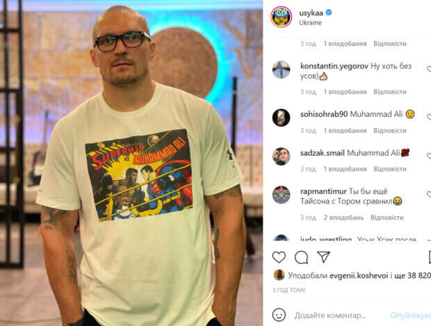 Кроме этого, совсем недавно Усик коротко подстриг волосы. «#Superman или/or #MuhammadAli ?!», - подписал фото Усик, намекая на свою стильную футболку. В комментариях боксеру оставили массу отзывов по поводу его внешнего вида и футболки. «Что за ботан?», «Ты бы ещё Тайсона с Тором сравнил», «Конечно же, Мухаммед Али)», «никто никогда не будет таким, как Али», «Стиляга», «Чак Норис онли», «Новое амплуа?», «Саня лучший», «Ну хоть без усов)», - пишут пользователи сети. Как известно, 25 сентября должен состояться бой Александра Усика и британского боксера Энтони Джошуа. Напомним, что Александра Усика вычеркнули из Всемирного рейтинга перед боем с Джошуа: кто занял место боксера. А еще Politeka писала, что Усик показал, что ест, впечатлив украинцев: "Всё, Джошуа точно ляжет". Также Politeka сообщала, что Усик похвастался своей физической формой, кадры: "Что нам снег, что нам зной".