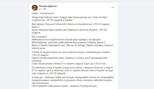 Погода в Украине резко изменится Дожди и грозы на время покинут страну, а температура воздуха прогреется до +35. Об этом предупредила синоптик Наталья Диденко в Фейсбук. Во вторник, 22 июня на термометрах местами будет +35 градусов. "Жара - усиливается! Западноевропейские горячие градусы уже придвинули к нам и поэтому на неделе готовьтесь к +30+35 градусов в Украине!